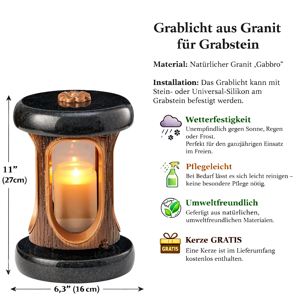 Durch die massive Granitbasis steht die Lampe stabil auf dem Grabstein und ist weniger anfällig für Umkippen bei Wind.
