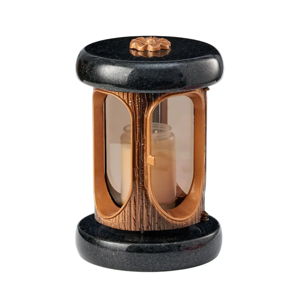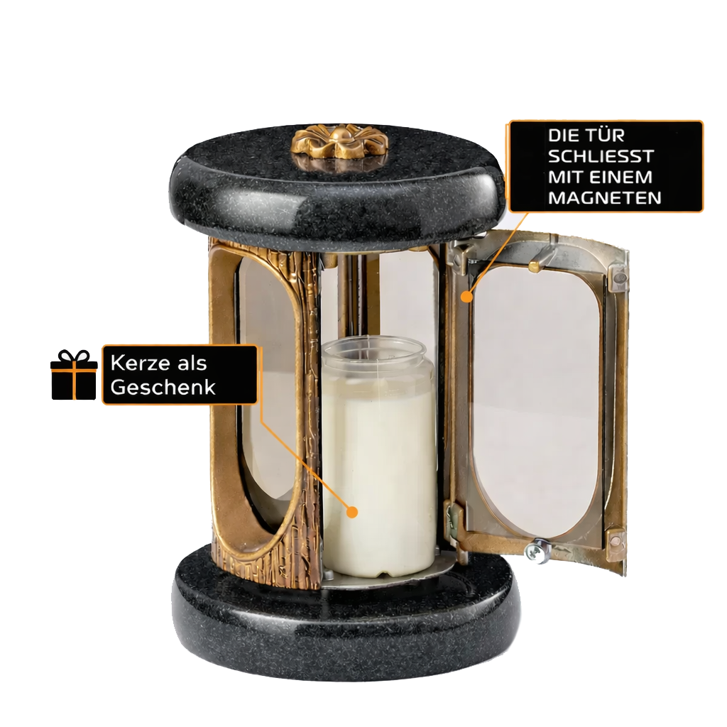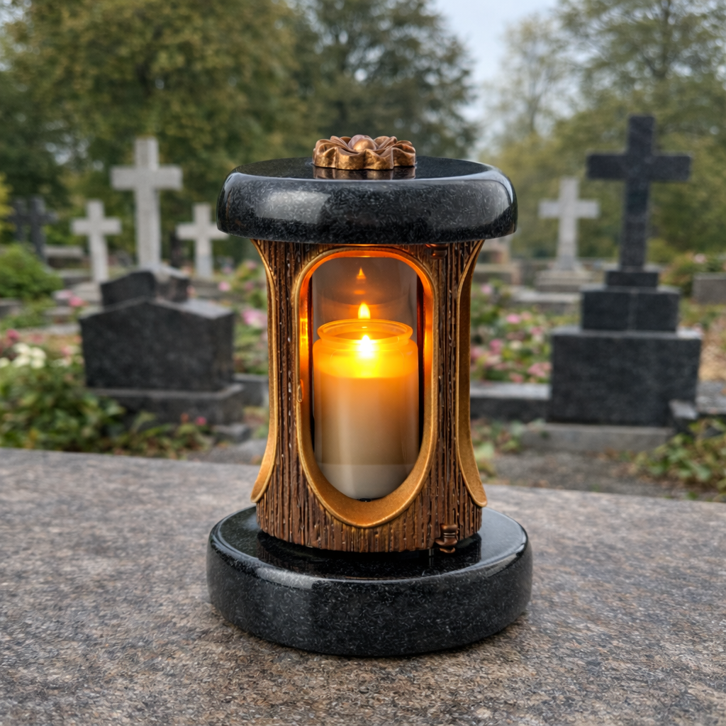 Diese hochwertige Grablampe verbindet natürlichen schwarzen Granit mit Aluminium-Elementen und wurde für eine würdevolle und stilvolle Grabgestaltung entwickelt. Das zeitlose Design passt sowohl zu modernen als auch zu klassischen Grabsteinen.